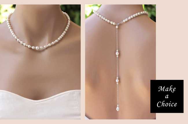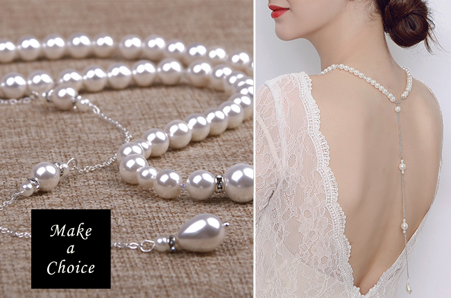 A170510【現貨】簡約優雅珍珠水鑽露背後背鍊【銀色】。新娘飾品