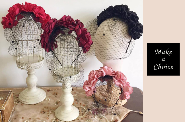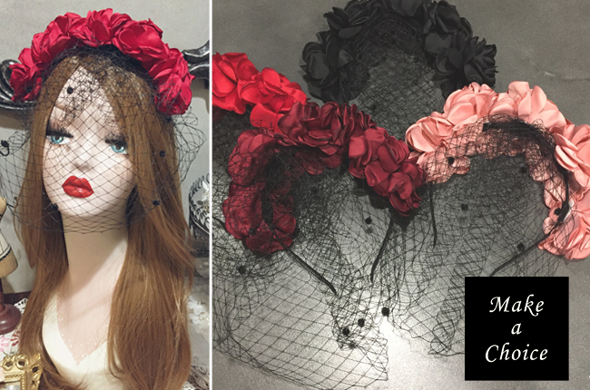 A180604【現貨】歐美立體燒邊花朵絨點黑色面紗髮箍花環花圈【四色】