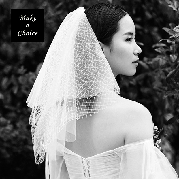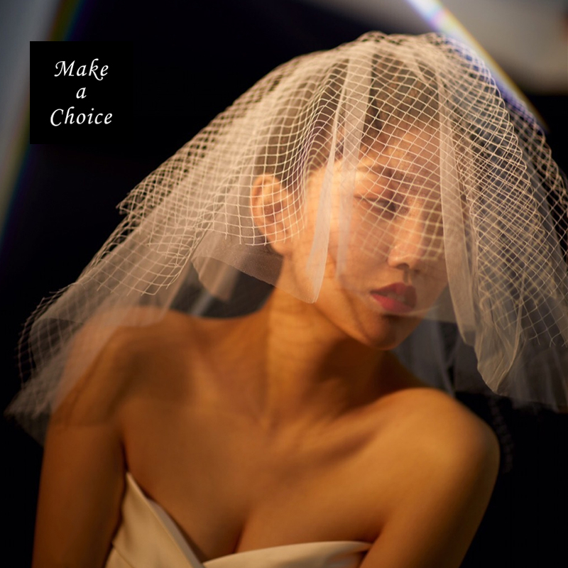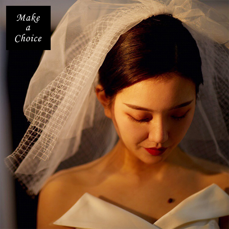 ★ 此款為60cm以下的短款頭紗,二層白紗+二層網格,最上層短白紗、網格可往前當做面紗 (可只掀短白紗當面紗,或短白紗+短網格當面紗....可以變化不同樣式,可依個人喜好感覺調整)。而且短頭紗可戴高戴低都有不同的效果。