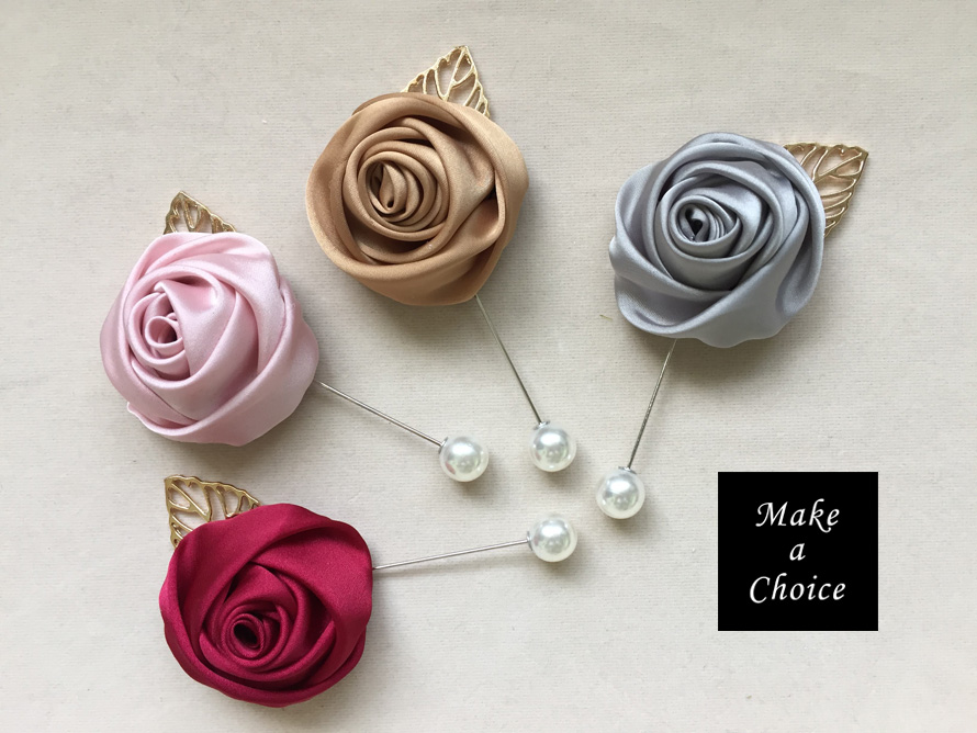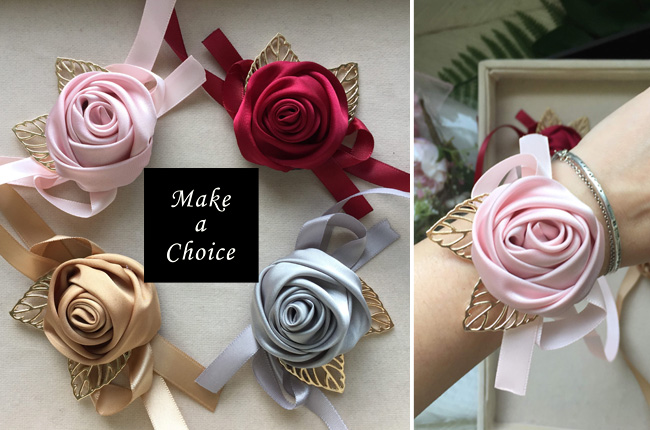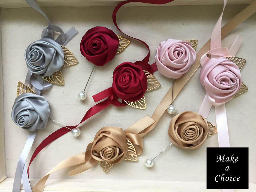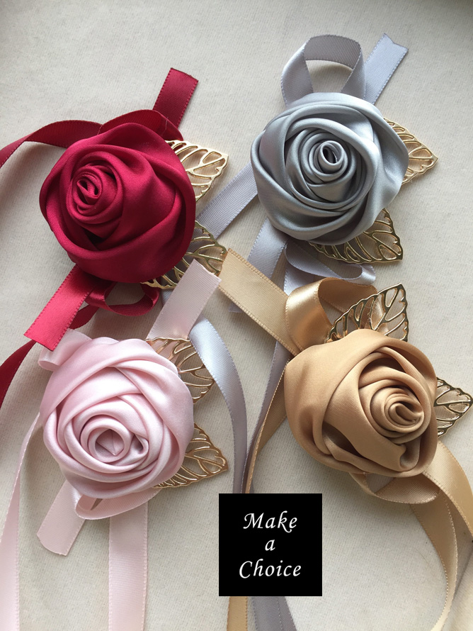 ★ 品名:質感仿真綢緞面玫瑰花金葉綁帶式手腕花胸花【粉色】