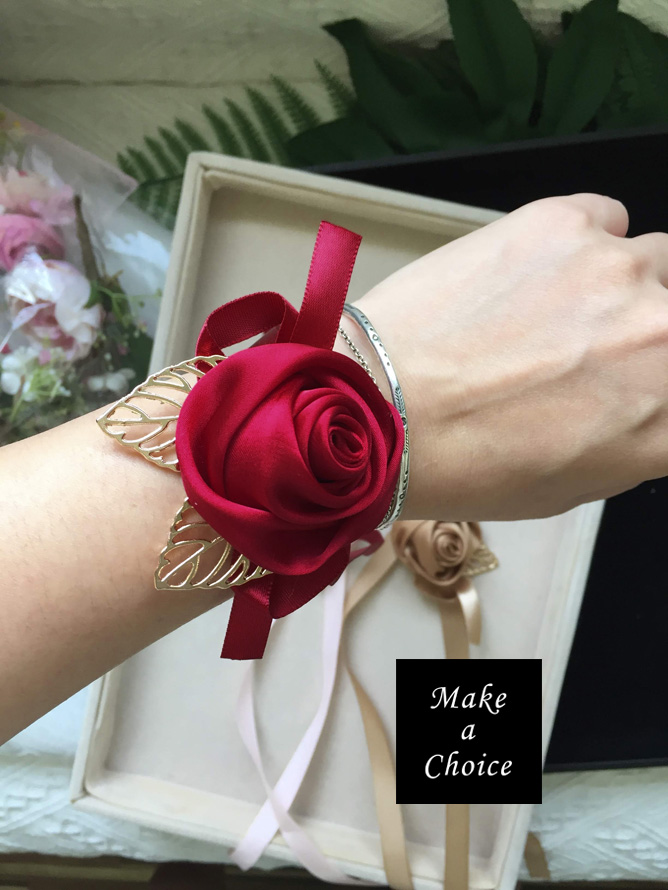 【A181105】【現貨】緞面玫瑰花金葉綁帶式手腕花胸花【酒紅色】