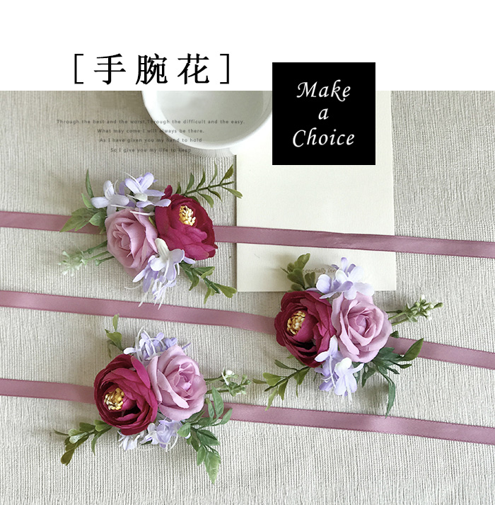 ★ 品名:森林系手工唯美花朵緞帶手腕花手環胸花【紫紅色】