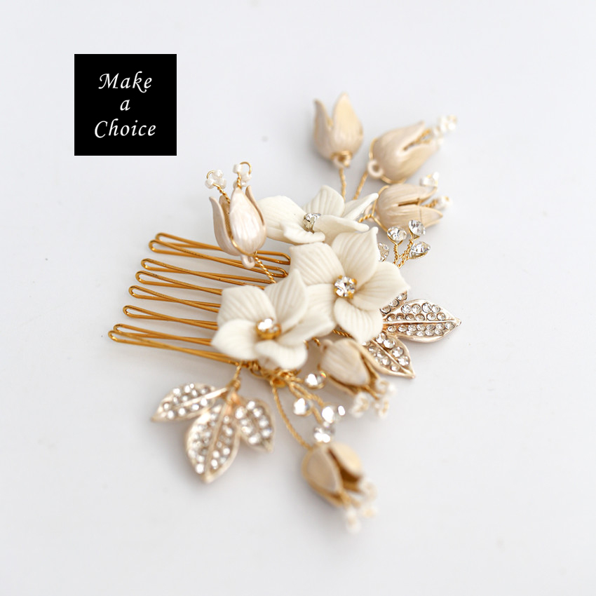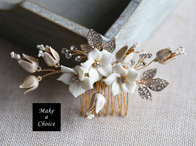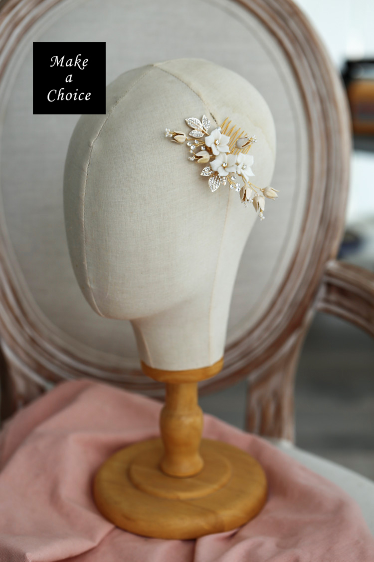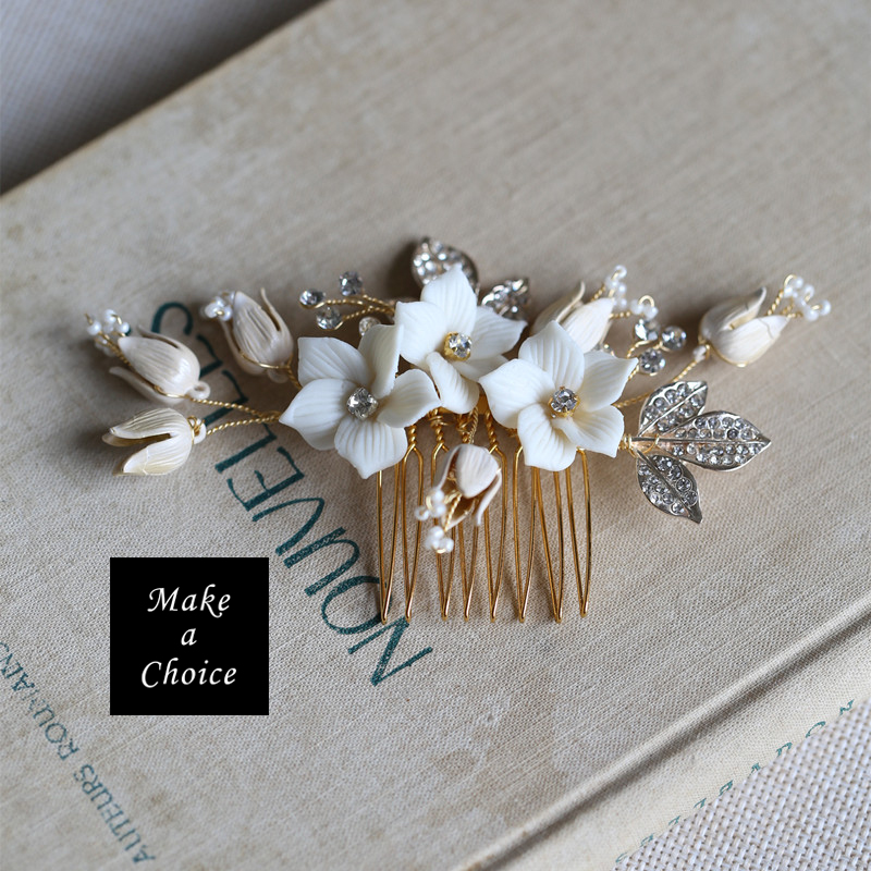 ★ 品名:手工白色陶瓷花花朵水鑽串珠小髮梳