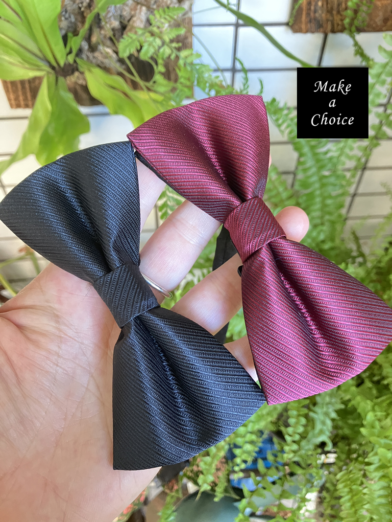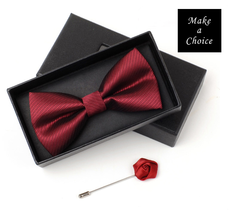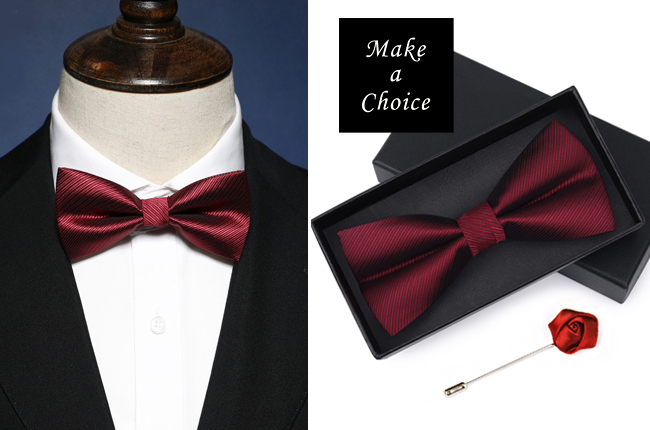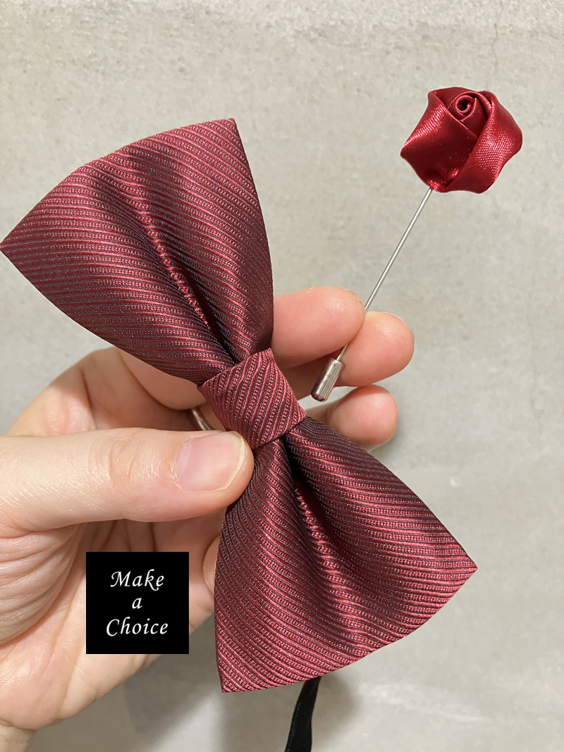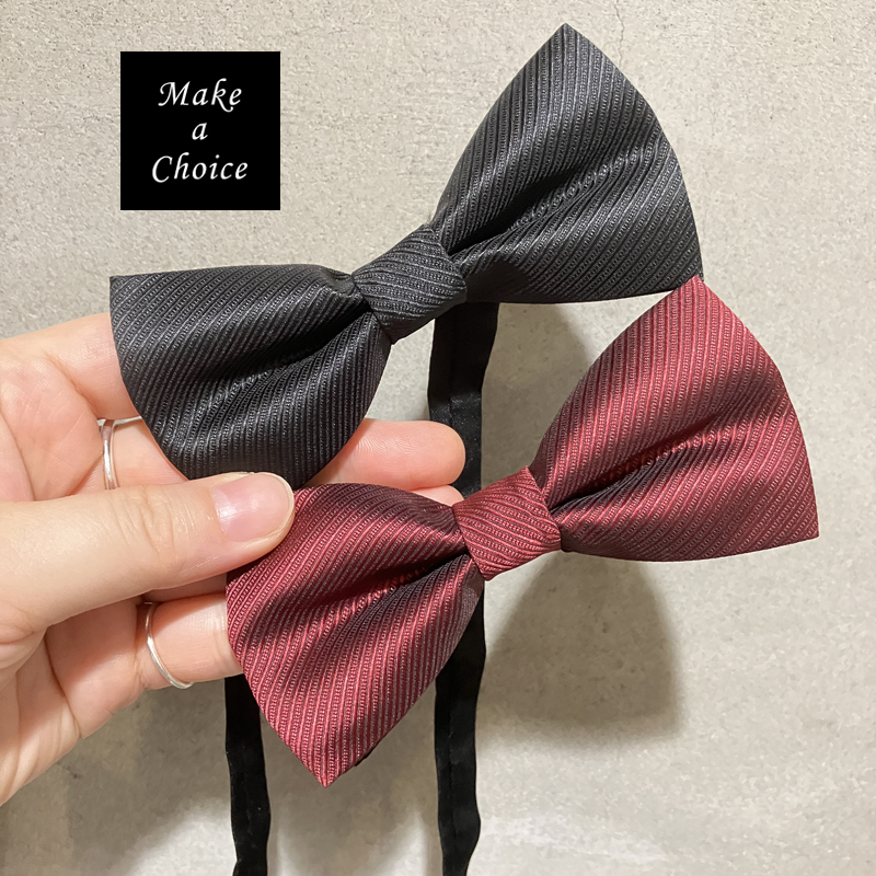 ★ 【新版簡約包裝】斷貨很久的領結重新到貨上架,新版的為簡約黑色紙盒包裝,無Logo內襯紙,可接受請再下單唷!蝴蝶結領結硬挺不會鬆軟,酒紅斜條紋帶有低調光澤感,非常好搭配,領結背面為全黑,調整帶、插扣皆為黑色,調整帶無單性,最長可調整至55cm左右,附棒針式酒紅色胸花一件。