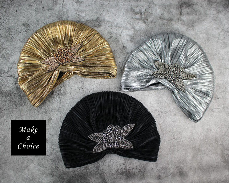 ★ 品名:歐美復古閃亮串珠褶皺包頭帽造型帽【金色、銀色】