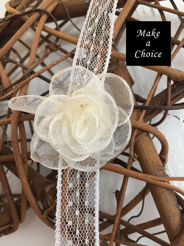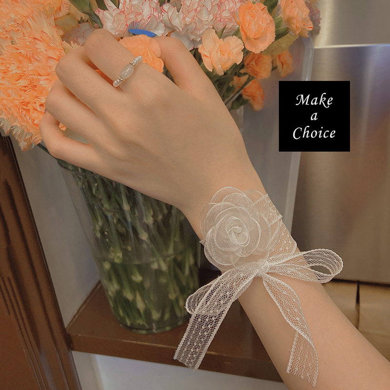 ★ 米白色網紗山茶花 + 白色蕾絲緞帶,可當項鍊亦可當手環,多種帶法。可當娘伴配件或手腕花使用,非常清新的設計。