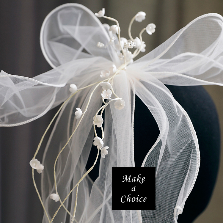 ★ 品名:浪漫唯美串珠小白花滾邊網紗不對襯大蝴蝶結髮夾頭紗髮飾