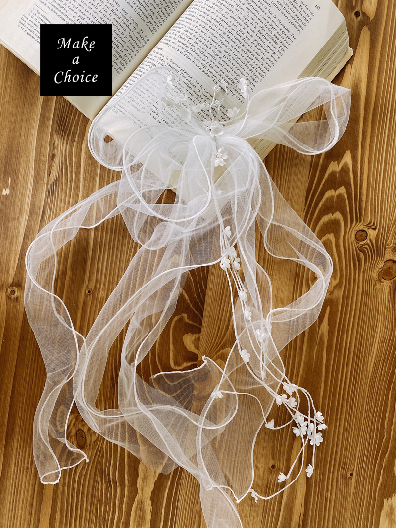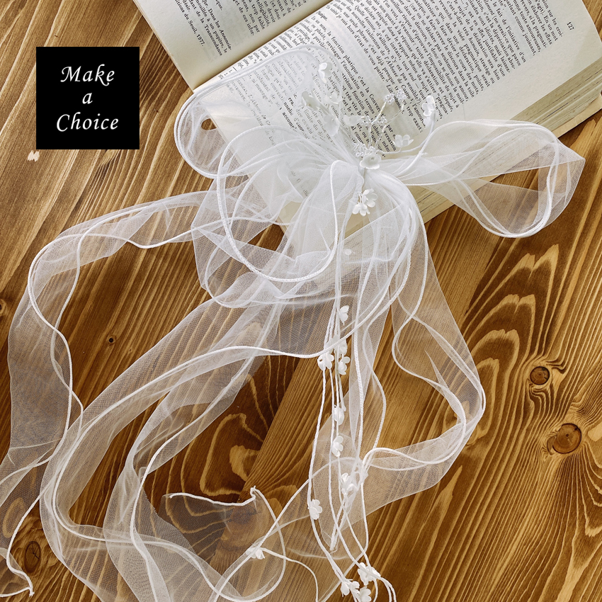 A211201【現貨】浪漫唯美串珠小白花滾邊網紗不對襯大蝴蝶結髮夾頭紗髮飾。自助婚紗旅拍寫真