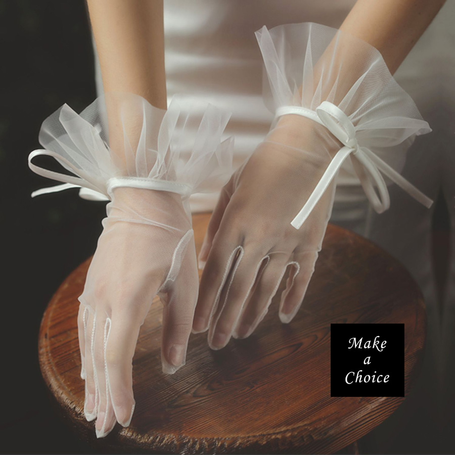 A220803【現貨】法式復古甜美蝴蝶結綁帶薄款網紗花邊微彈性短手套。結婚新娘飾品派對【白色】