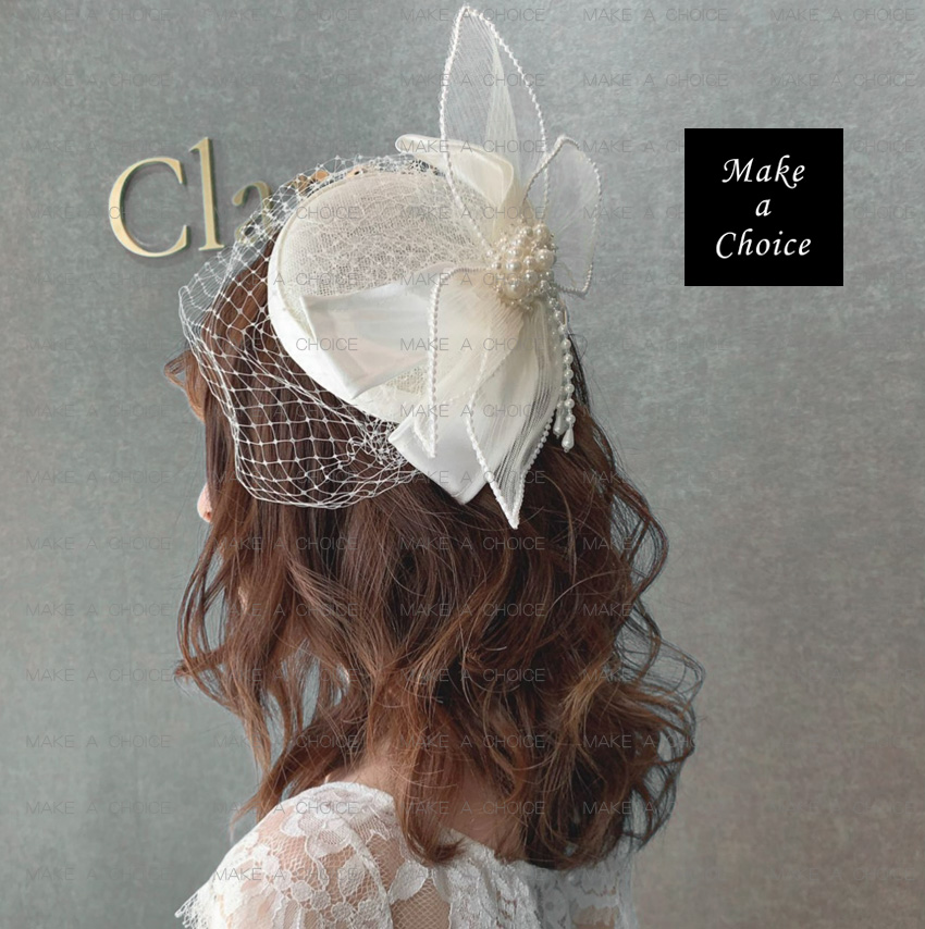 ★ 小禮帽面料為棉麻材質,,蝴蝶結第一層為白色緞面、第二層為香檳色細網紗蝴蝶結,鑲綴仿珍珠,更增優雅甜美感,可360度隨意佩戴,網紗設計配帶效果用無法完全遮面唷!