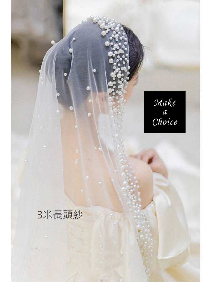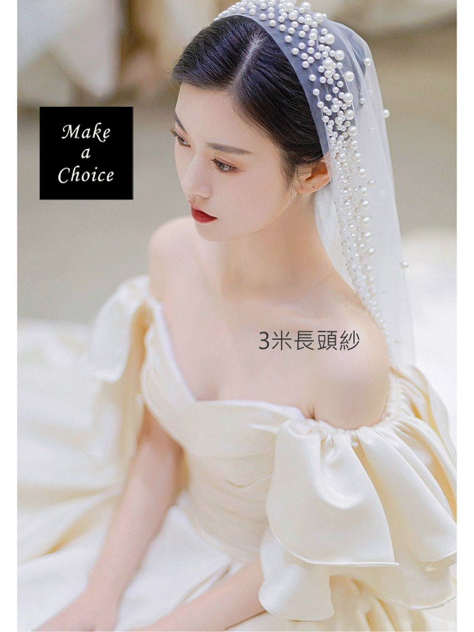 A230803【現貨】唯美重工釘珍珠單層軟紗造型頭紗【1.2米、3米】。新娘飾品寫真造型攝影拍照