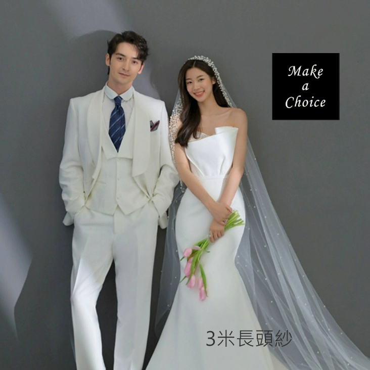 ★ 此款為單層軟紗設計,整面有珍珠釘飾,大小珍珠交錯,一邊重帶狀工釘珍珠,共分二款,中長款1.2米及拖尾3米長度,可配搭婚紗禮服長度挑選。此款為單層故「無」附金屬髮梳使用,請用下黑夾加強固定。