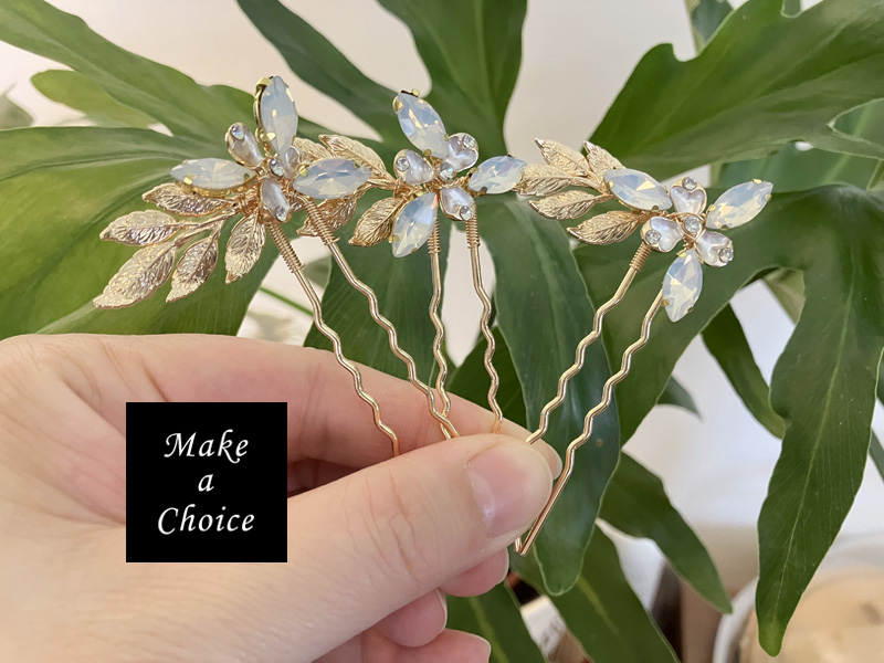 ★ 品名:金色枝葉蛋白鑽髮梳*1+髮簪*2套組