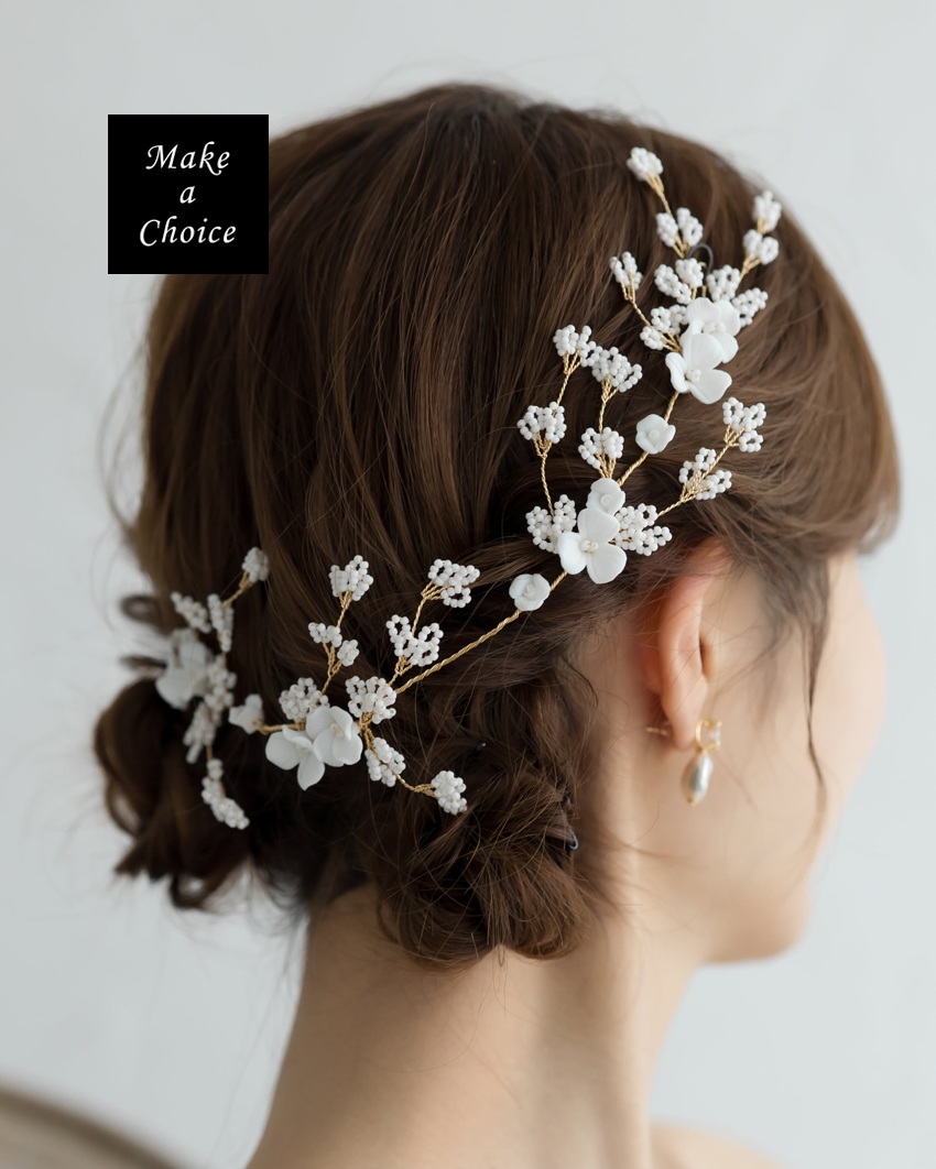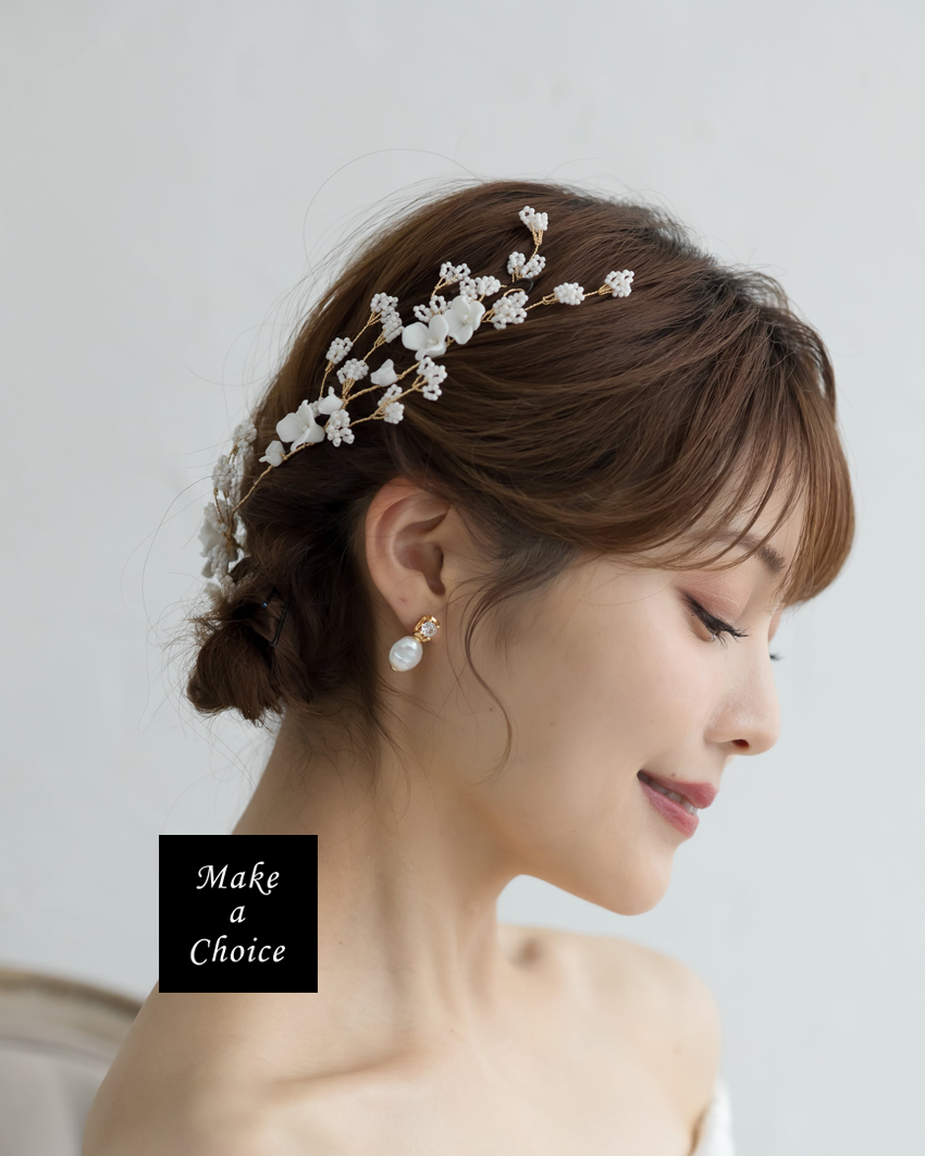 A240701【現貨】手工唯美白色陶瓷花朵串珠金色髮飾髮帶髮條。新娘飾品自助婚紗旅拍寫真