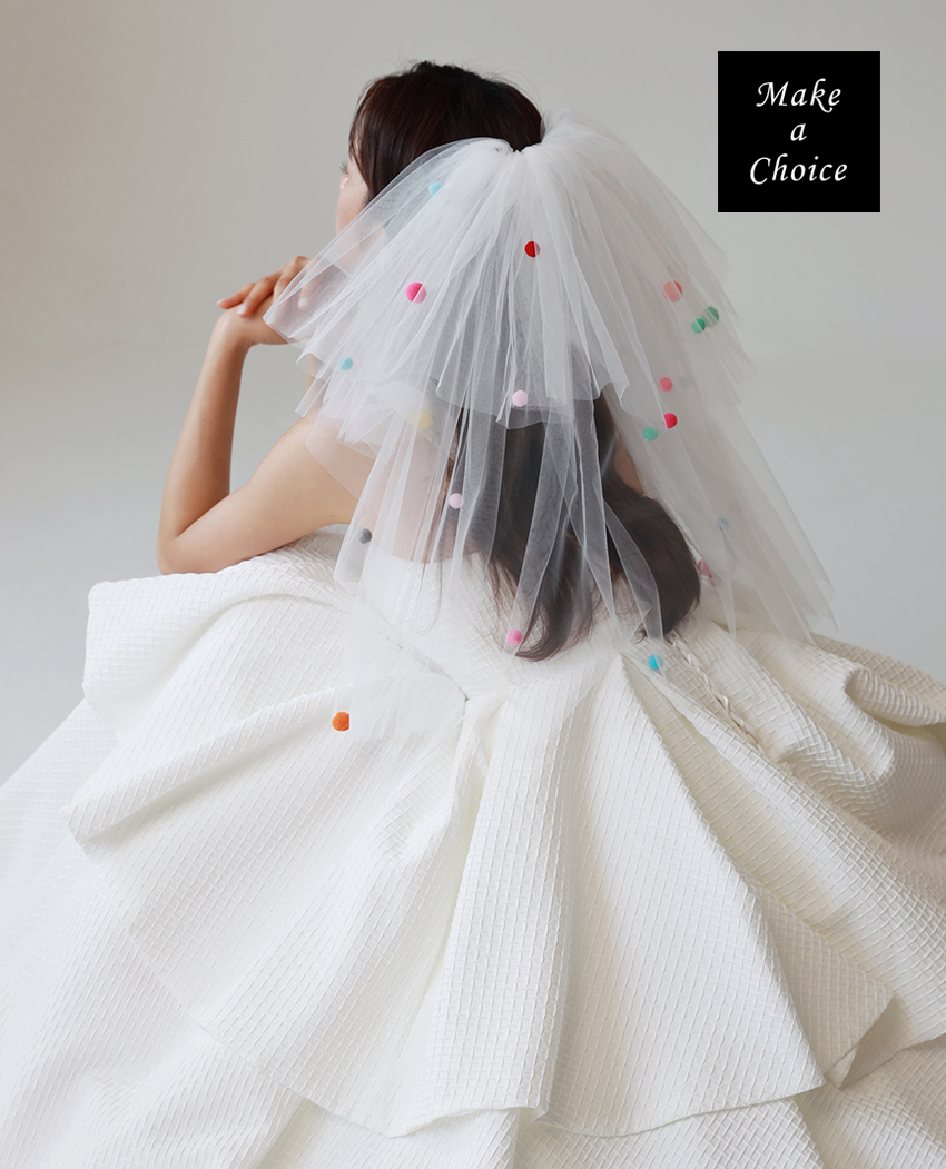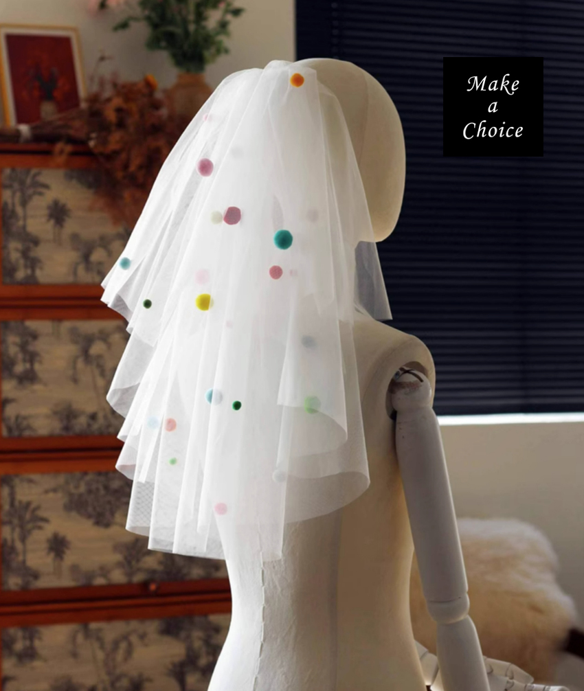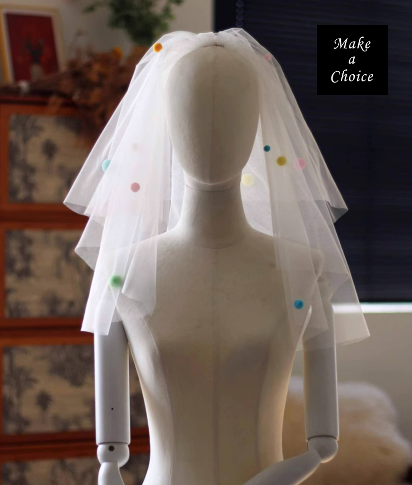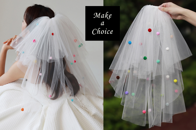 ★由於彩色絨毛球球是用黏著劑固定,故有脫落可能,若收到頭紗球球有脫落狀況,麻煩動手黏貼回去即可,用蒸氣熨斗整熨頭紗時,請避開球球位置部份,黏膠會受熱溶化造成球球脫落。