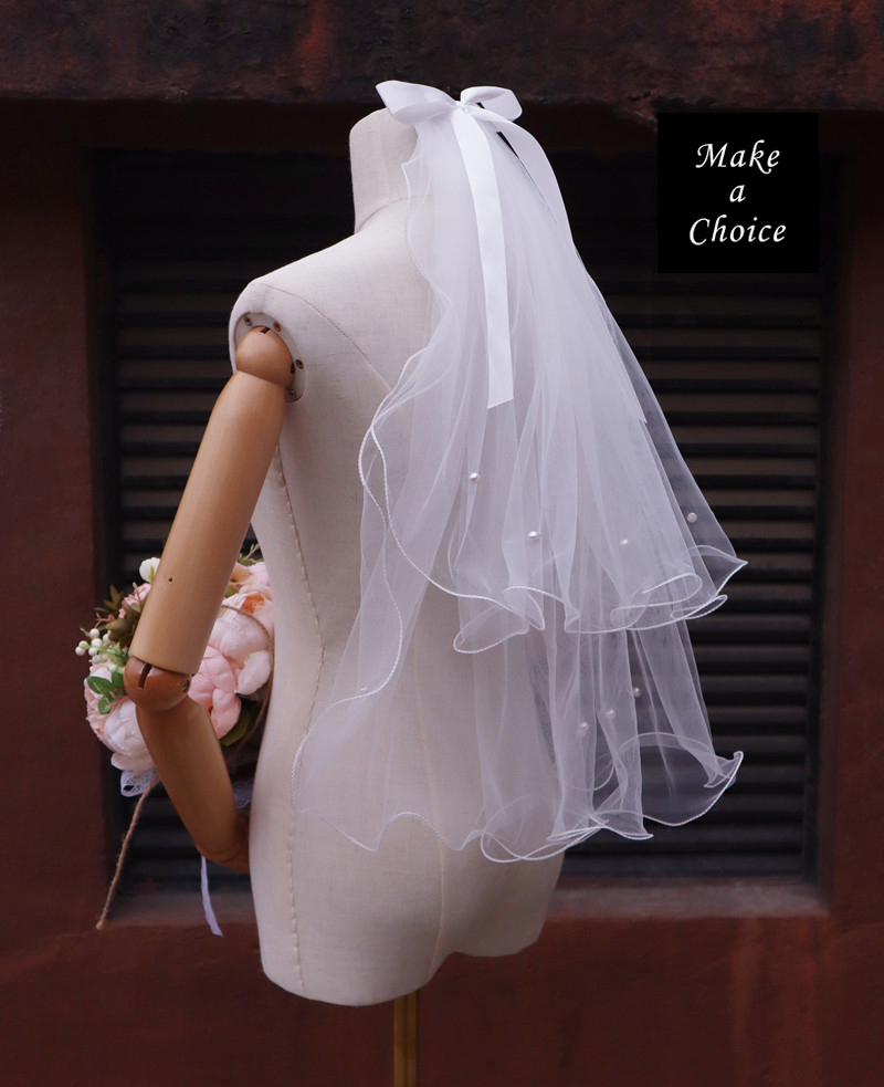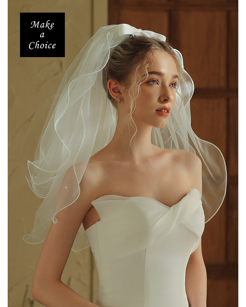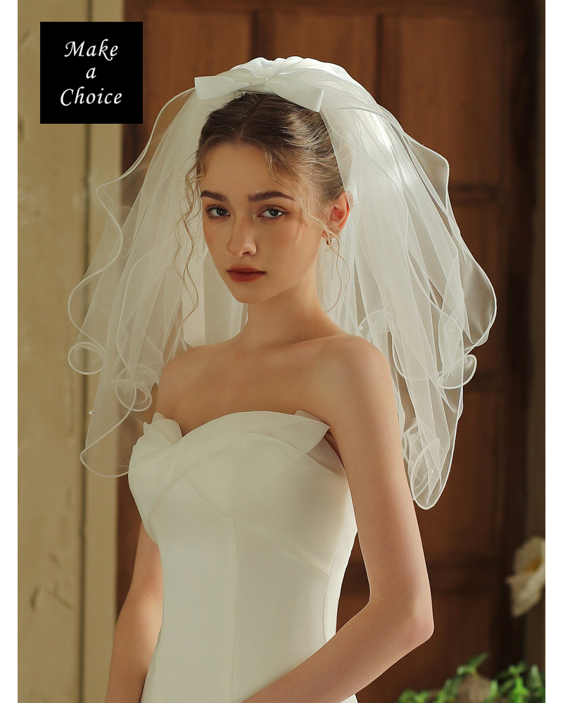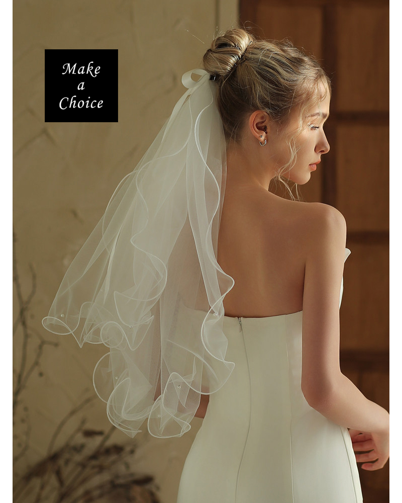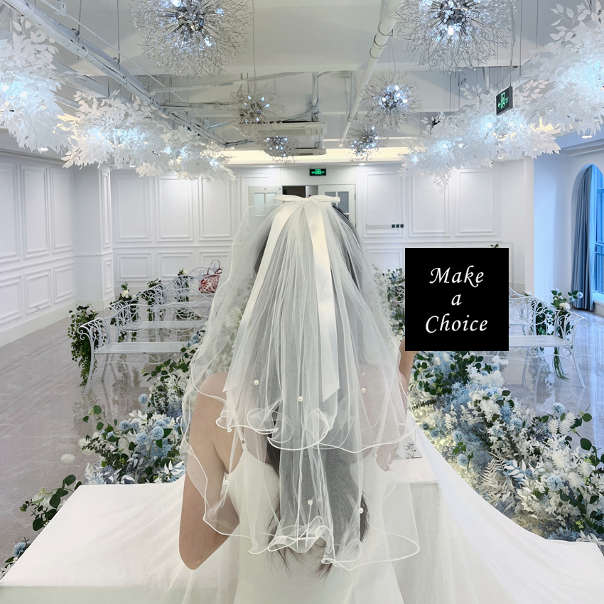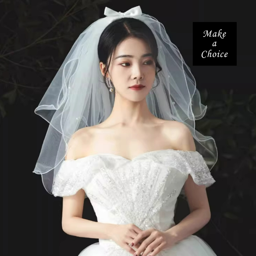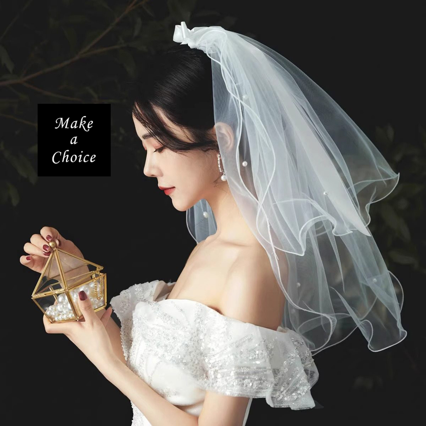 A250904【現貨】甜美復古二/雙層蓬蓬澎澎蝴蝶結珍珠釘珠軟紗造型頭紗【髮夾款】。結婚登記頭紗新娘頭紗自助婚紗
