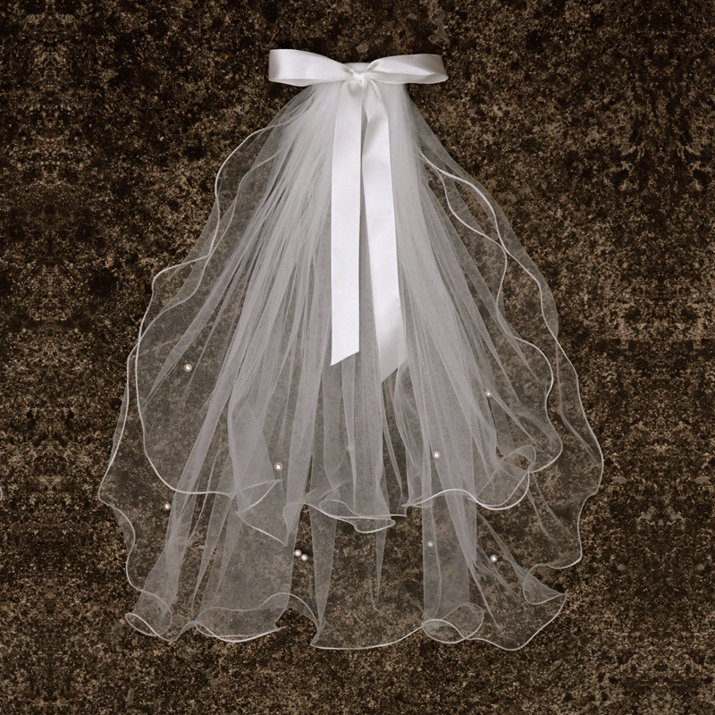 ★ 品名:甜美復古二/雙層蓬蓬澎澎蝴蝶結珍珠釘珠軟紗造型頭紗【髮夾款】