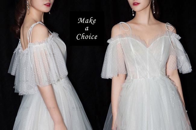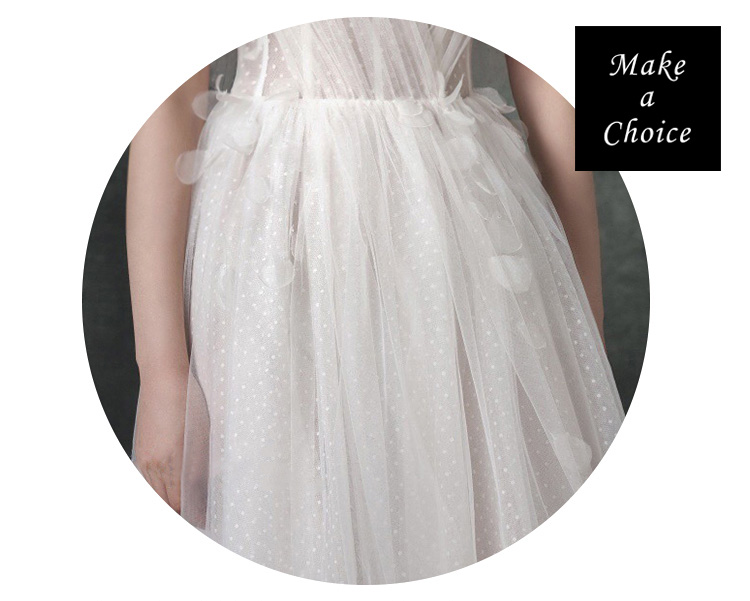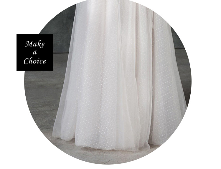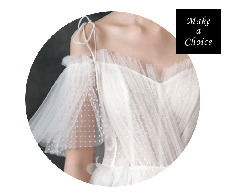 ★ 肩上有吊帶設計(二種穿法:可綁可不綁,不一樣感覺,請試試那個最適合妳自己),點點網紗面料舒適柔軟,唯美喇叭袖,後背部為綁帶設計,內襯為白色,裙長為齊地設計,適合自助婚紗、草地婚禮、旅拍。*若不需要吊帶即可自行剪掉。