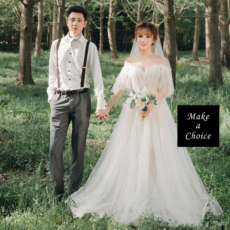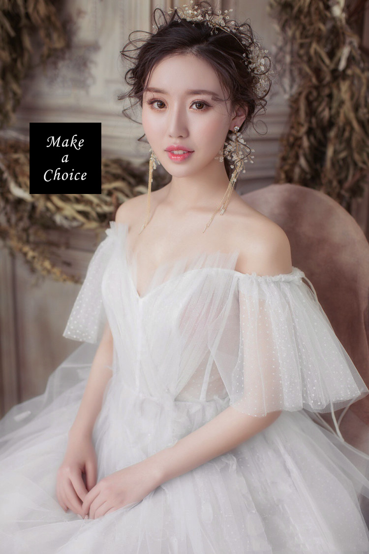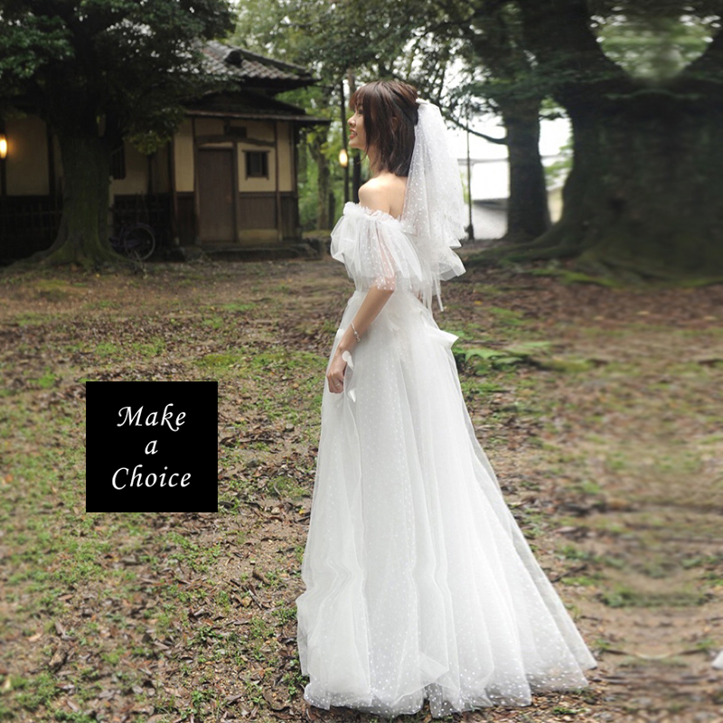 ★ 品名:一字領露肩浪漫白色點點蕾絲喇叭袖齊地綁帶式輕婚紗輕禮服