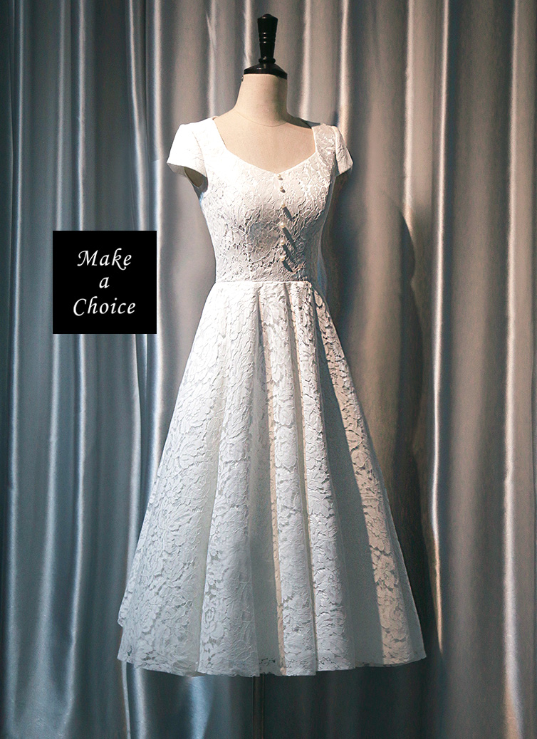 ★ 這款一款平日也適合的小禮服洋裝,整件是軟柔的蕾絲面料,中長款設計,,漂亮的小方V領設計,及仿珍珠排扣設計,修身版型,具有垂墜感,美完的下身A Line設計,後背拉鍊試穿脫,非常方便,適合自助婚紗、草地婚禮、旅拍、派對。