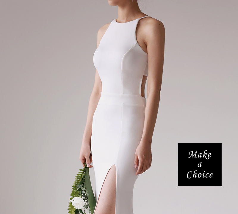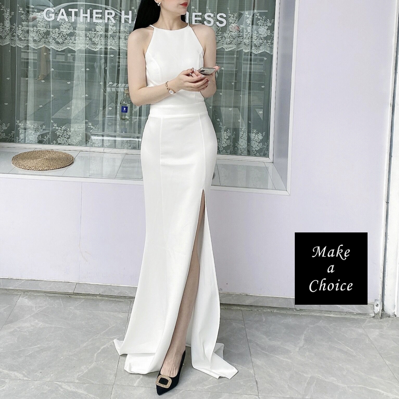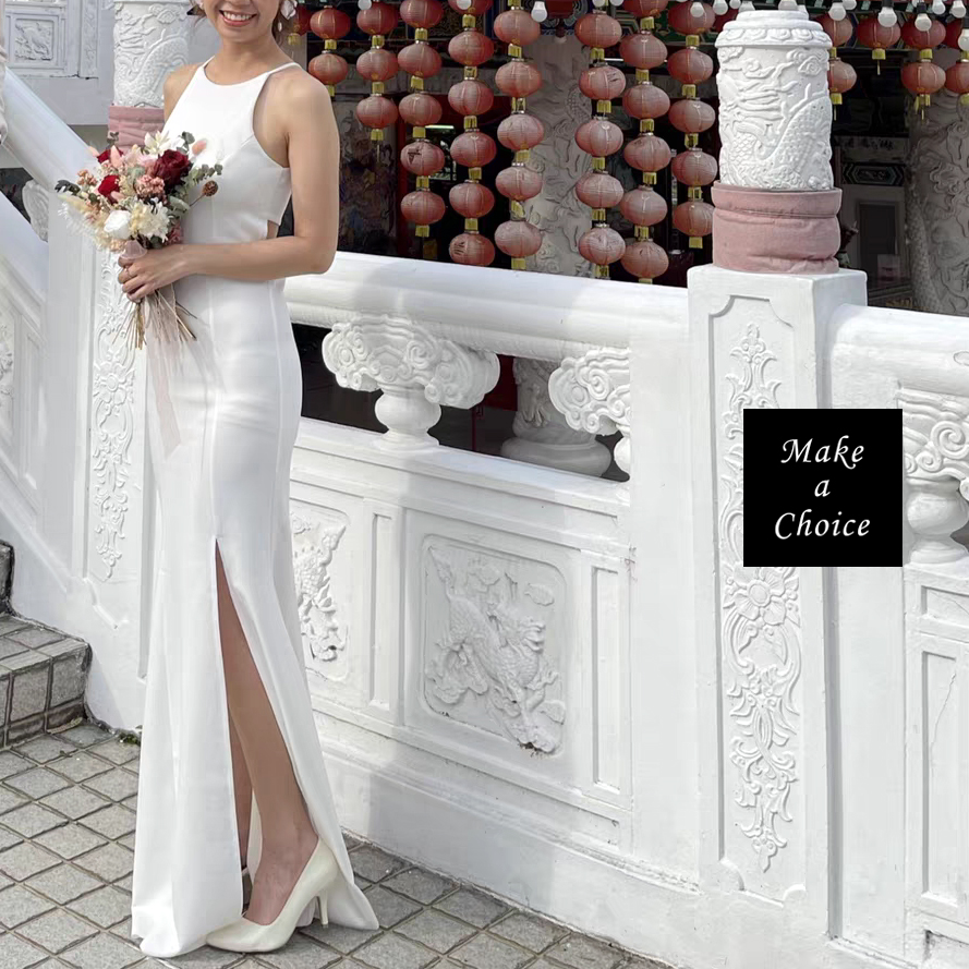 C230202【S-XL】【預購】白色修身削肩式掛脖開叉魚尾長款輕婚紗輕禮服。新娘結婚晚會派對