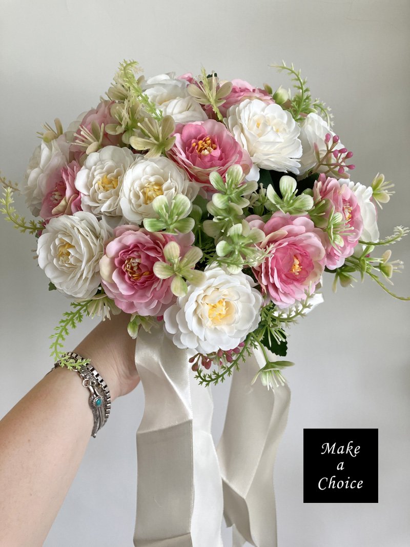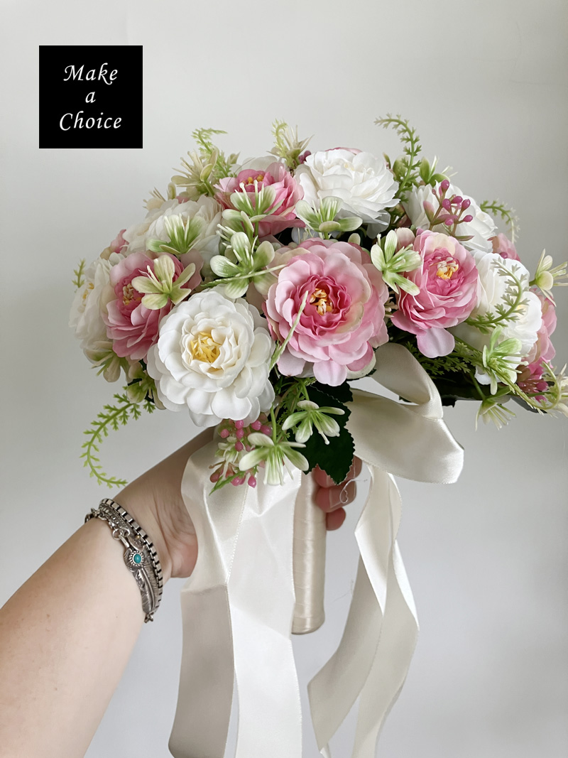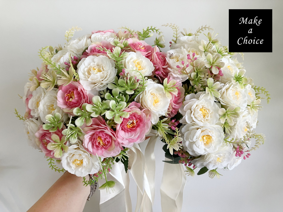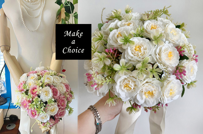 ★ 仿花捧花多為塑料材質,手工製作會使用接著劑黏合,做好直接密封包封,多少會氣味殘留,若氣道太重可放著陰涼通風處使其揮發氣味。