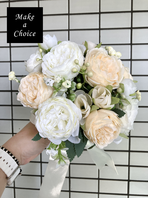 H230501【現貨】韓式小束波斯玫瑰絹花仿花蝴蝶結綁帶小束手捧花新娘捧花【白+香檳色】